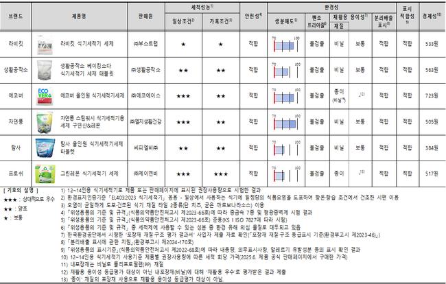 한국소비자원이 시판 중인 정제형 식기세척기 세제 6개 제품을 시험·평가한 결과, 세척성능과 1회 세척당 가격에서 제품 간 차이가 나타났으나 생분해도와 안전성은 전 제품이 관련 기준을 충족한 것으로 확인됐다.