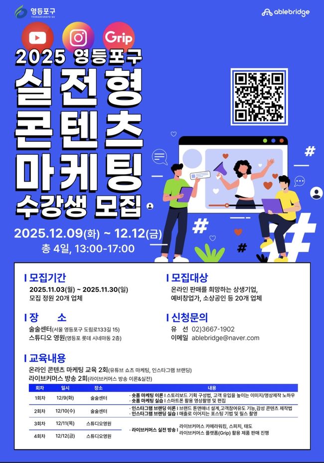 온라인 마케팅 교육은 오는 12월 9일과 10일 이틀간 술술센터에서 열린다. △짧은 영상(숏폼) 기획법 △고객 유입을 높이는 영상 제작법 △브랜드 이미지 설계법 △매출로 이어지는 온라인 게시 기법 등 실전 중심의 강의가 마련되며, 실습을 통해 실무 능력을 강화할 예정이다.