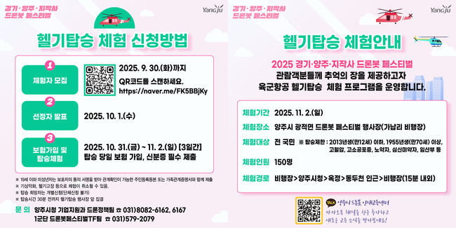 참가 신청은 양주시 공식 홈페이지 또는 SNS 채널을 통해 가능하며, ‘2025 드론봇 페스티벌 헬기탑승체험’ 안내 게시물을 참고해 온라인으로 신청하면 된다.