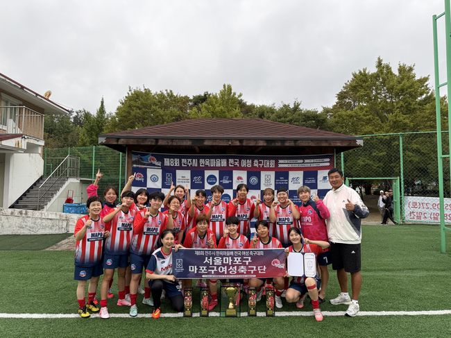 서울마포구 여성축구단 입상.서울 마포구(구청장 박강수)가 지원하는 ‘마포구 여성축구단’(단장 박종래)이 지난 9월 27~28일 전주시 덕진체련공원과 완산체육공원에서 열린 제8회 전주시 한옥마을배 전국 여성 축구대회에서 챔피언에 올랐다고 밝혔다.