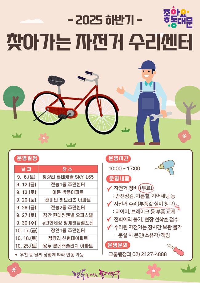2025 하반기 `찾아가는 자전거 수리센터` 홍보 포스터.동대문구는 운영 기간을 9월부터 10월 말까지 약 2개월로 정하고, 공동주택과 일부 주민센터를 직접 방문해 자전거 수리 서비스를 제공할 예정이다. 올해 상반기에도 주민센터 10곳과 공동주택 1곳에서 수리센터를 운영해 주민들로부터 큰 호응을 얻은 바 있다.