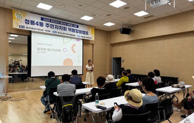 정릉 4동 주민자치회 역량강화캠프.이번 캠프는 주민자치위원들의 역량을 높이고 지역 발전을 위해 봉사하는 위원들의 노고를 격려하기 위해 마련됐으며, 10일 열린 행사에는 자치위원 29명과 관계 공무원, 지원관 등 32명이 참여했다.